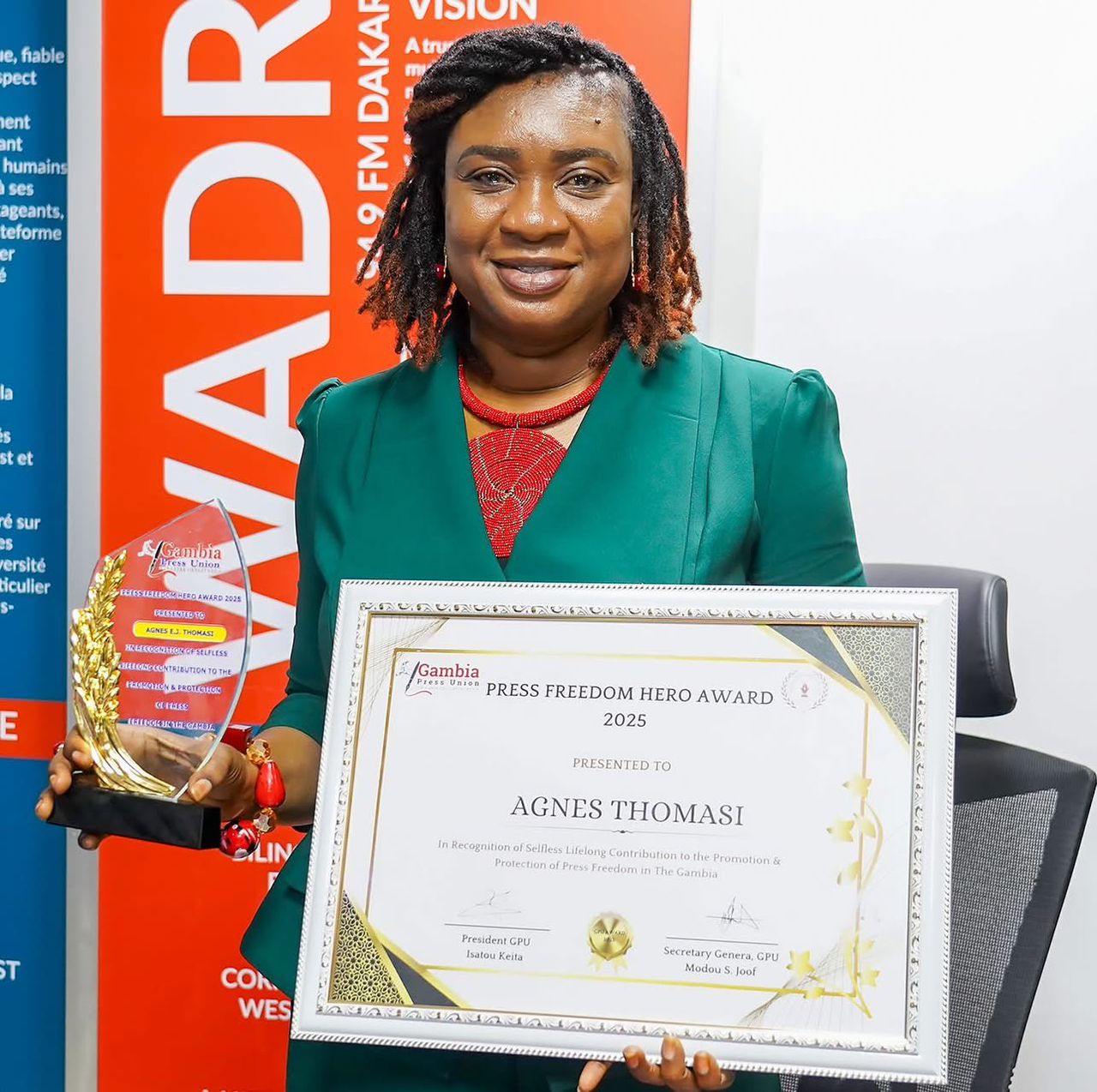 Lors de la 10ᵉ édition des Prix nationaux du journalisme, organisée par la Gambia Press Union National Journalism Awards (GPU), la Directrice de la station West Africa Democracy Radio (WADR), Mme Agnese John Thomasi, a été honorée de la prestigieuse distinction de Héros de la liberté de la presse et Ambassadrice de la GPU.